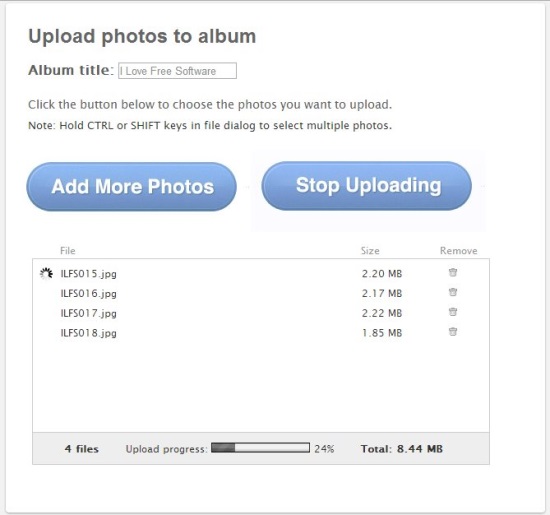 The free version is limited to upload upto 100 MB of photos (per month) to the account. Moreover, the albums get automatically deleted after 14 days. However, there’s option to go pro and get unlimited photo uploads, unlimited number of albums, and lifetime validity for albums.