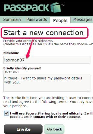 Step 3: After completing first two steps, you can invite people using Invite Someone button. Enter sharing nickname of other user and add some text to let other user know about this sharing.