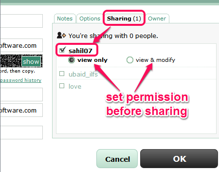 Once sharing has been activated, go to Passwords section, and access any password created by you. In entry details, access Sharing option. Now, you will find total number of users with who you have activated sharing. Here, simply select required for those users to start sharing your password details. Inspite of just sharing password details, you can also set permission: whether that person can only view password details or can modify them too.