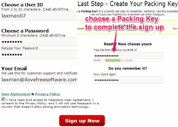 To use this shared password manager, sign up by entering a user ID, your email address, and password. In the next step, you need to enter a so-called ‘Packing Key‘, which could be anything. This packing key needs to be entered whenever you login to your Passpack account. This ensures double-protection and is quite similar to two step authentication for web services.