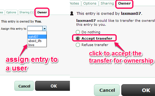 It is completely your choice whether you need to use Sharing and Owner option for same entry or for different entries. Use these options wisely and click OK button to finish sharing process.