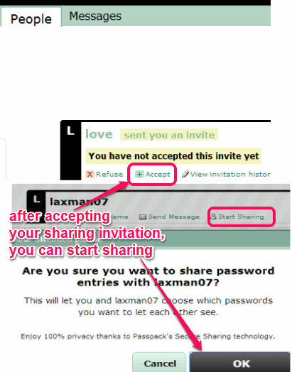 Step 4: This step requires approval of sharing invitation. Once your sharing invitation will be accepted by that person, you could start sharing using available button. The same button needs to be activated by that user, if he/she has to share his/her password details. Similarly, you can invite more people, and activate the sharing.