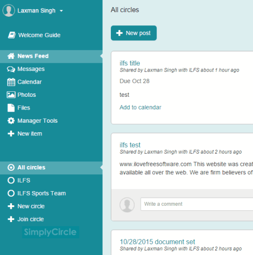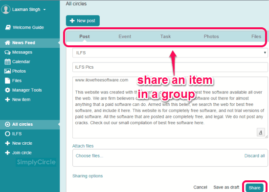 SimplyCircle is a free website to share files, events, photos, tasks, and updates with team members in a group. You will also be able to message them to discuss things related to a topic. So sharing the files and communicating with team becomes so easy. All you need to do is create groups (known as circles) and select what you want to post in that group.