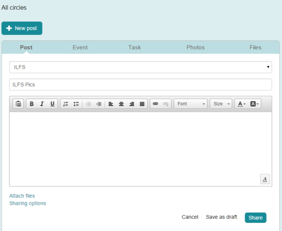 Now in your newly created circle, you need to add a new post. Use New Post button and options will be in front of you. You can select whether you want to share files (text documents), an event (with start and end time), an update with text content and attachments, or photos.