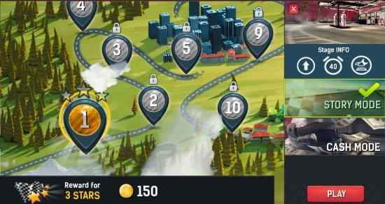The play button will bring you to the level or stage mode. You start with level one and your reward for completing this level in 150 coins. You can play this level in story mode or cash mode. Click the play button to start the game.