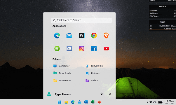 - In the screenshot below, you can see the Windows 11 Taskbar and Start menu that it adds. All the items are clickable; however, it lacks smooth animation.