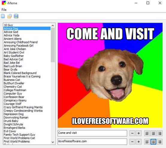 Free Meme Creator is a small and lightweight meme maker software, which works just fine on Windows 10. Because it’s lightweight, it doesn’t come with a large selection of meme templates that you can use. You’ll need to find the ones you want to use online, download them and then load them into Free Meme Creator by selecting “File >> New”.
