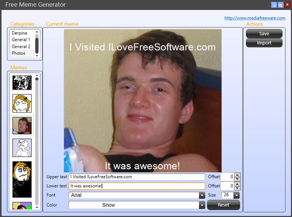 Number of built-in meme templates is higher than the one found in iMeme, mostly because Free Meme Generator includes things like derp faces, rage faces, etc. Caption setup is similar to that found in previously mentioned meme maker software, but like I said, it leaves much to be desired. Two captions can be added, one to the top of the image, and another to the bottom of it. Their offset can be tweaked in pixels, and you can also tweak font type, color and size. Free Meme Generator supports JPEG, PNG, and BMP as output formats of the created memes.