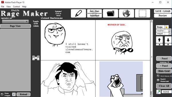Rage Maker is a different type of meme maker software for Windows 10. It’s intended to be used as a rage comic creator, like you can see from the image above. By default it has 4 comic panels setup in a 2X2 grid, but this number can be changed using the +Panel and -Panel buttons in the right-hand side.