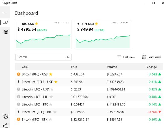 Crypto Chart is a Windows 10 cryptocurrency prices app wherein you can check the prices, volumes, and changes in cryptocurrency. Cryptocurrency is basically virtual currency secured by cryptography techniques. The most popular cryptocurrency you might have heard of is Bitcoin. You can track a lot of cryptocurrencies using this app like Bitcoin, Litecoin, Ethereum, Dogecoin, Dash, etc.