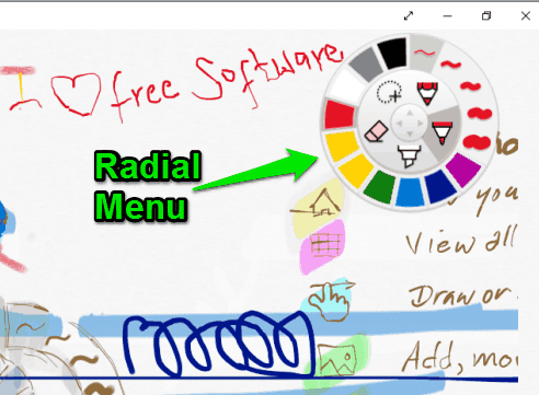 After creating the notebook, you will come to the very first page to create notes. You will see a Radial menu which contains all the tools that you can use to create notes and drawing. You will have Pen, Lasso Select, Pencil, Highlighter, and Eraser tools. Apart from this, you can also adjust the brush width or Eraser size using this menu. The Radial menu also includes a color palette. You can rotate that palette to find more and more colors.