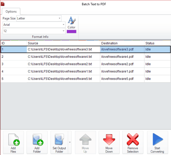 Batch Text to PDF is a very simple software. Still, it is a good bulk text to PDF converter software. It has basic but sufficient options to bulk convert text files to PDF documents. You can drop multiple text files or use Add Files or Add Folder button to add the text files. After that, you can set the font size, color, font style, and page type (Letter, Legal, Ledger, P11*17, A0-A6, and B5). One useful feature that I didn’t find in other software is that you can arrange input text files. However, the output doesn’t come as a single PDF file. A separate PDF file is generated for every text file.