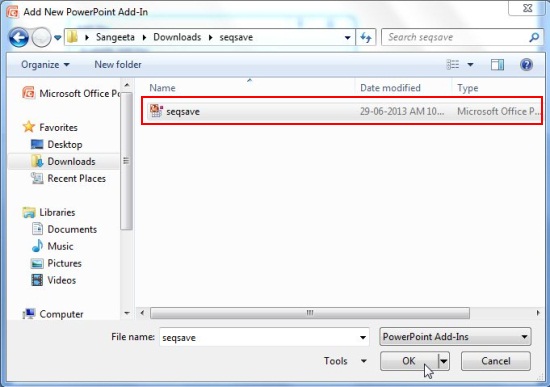 - Now a tick will be displayed against Sequential Save’s entry in Add-Ins window when the add-in is properly loaded. Close the window and restart PowerPoint.