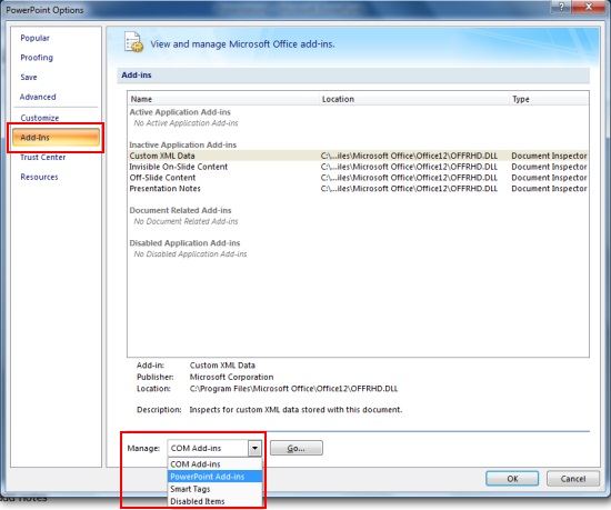 - Click on “Add-Ins” tab and choose “PowerPoint Add-Ins” option from the “Manage” drop-down.