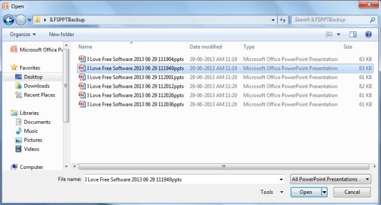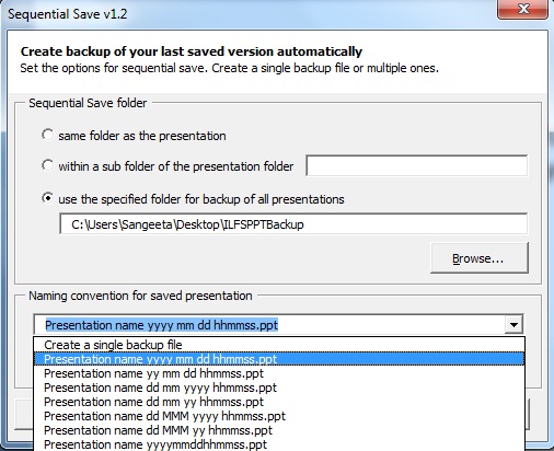 Now once this is done, you can simply click on the “Sequential Save” button on the “Add-Ins” tab, whenever you want to create a backup of your presentation. That’s it! This free PowerPoint addin will create several backups of the presentation and save them in the destination folder as shown in the first screenshot.