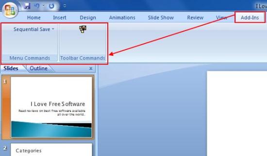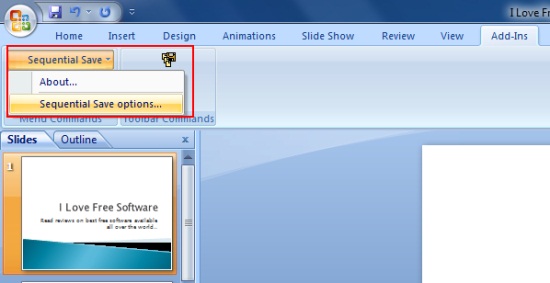 Sequential Save will now appear in the “Add-Ins” tab of your PowerPoint window. But in order to use this free PowerPoint addin properly, you will first have to configure it, otherwise, it will behave like the normal “Save” option.