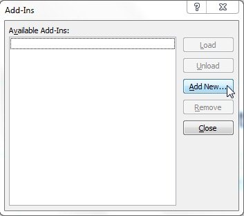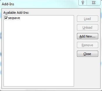 - Click on “Go” button. This will open an “Add-Ins” window. Click on “Add New..” button and browse the folder where the Sequential Save zip file was extracted.