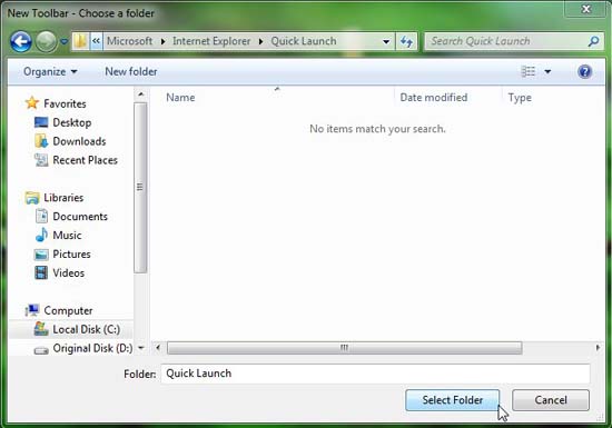 - Now enter or paste the following path in the location bar of the window that appears (without quotes): “%appdata%\Microsoft\Internet Explorer\Quick Launch“.