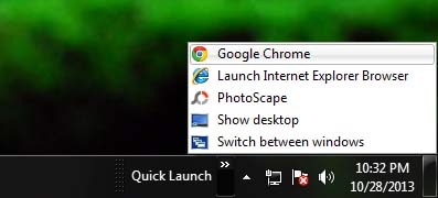 You might have noticed that many third party software offer an option to add themselves to the Quick Launch Bar during installation. You can see all those shortcuts right there, within this newly added Quick Launch Bar. Just double-click on it to stretch it over the taskbar and see the hidden apps. Or else click and drag the edge of the Quick Launch Bar (the dotted lines) towards the left side to view the content apps.