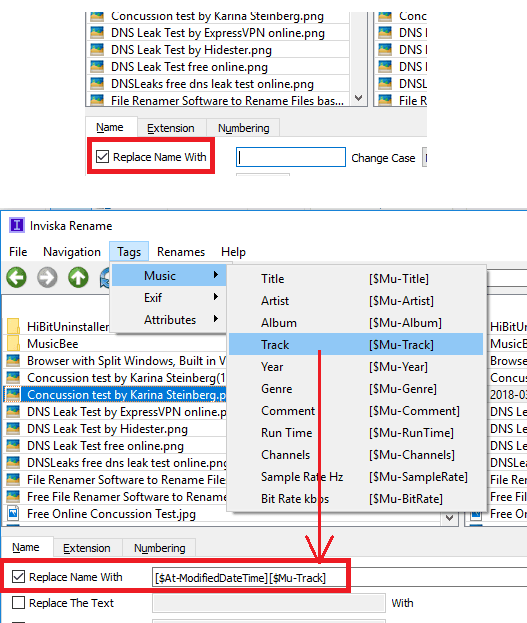 Step 2: Now, you can check the “Replace Name With” option. The text box will now be enabled. After that, you can add different ID3 or Exif tags in it. To add tags, you can use the “Tags” menu of the software. In the “Tags” menu there are options to choose ID3 and Exif tags to add in the rename. You can click on any tag and and it will be added in the name.