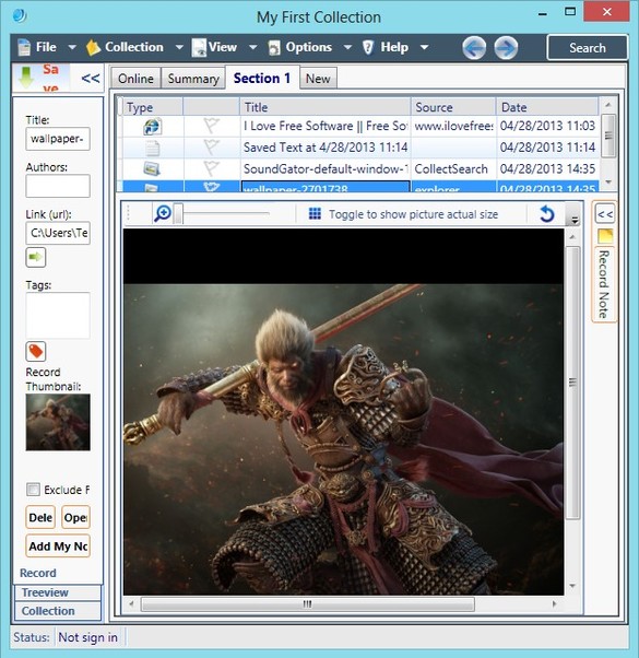 CollectSearch is a free information management software for Windows which allows you to easily save and manage a database of pretty much everything, website links, websites, photos, text notes, files, email messages.
