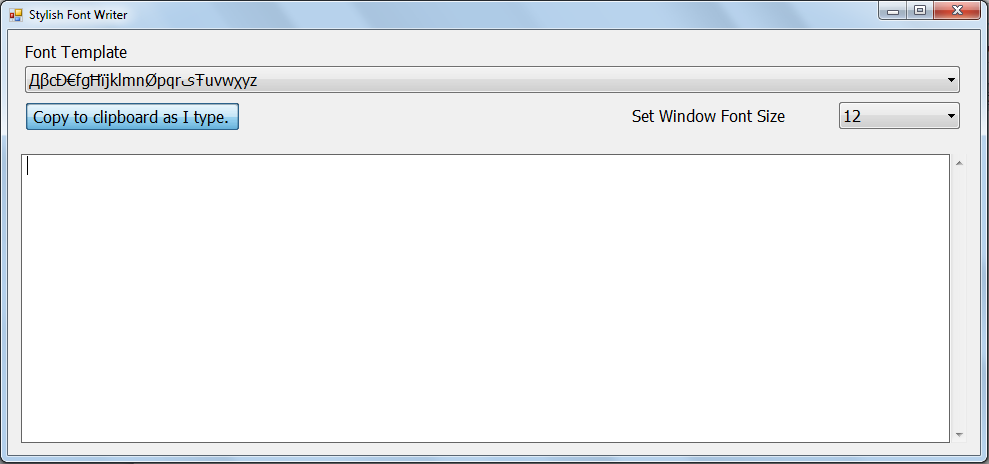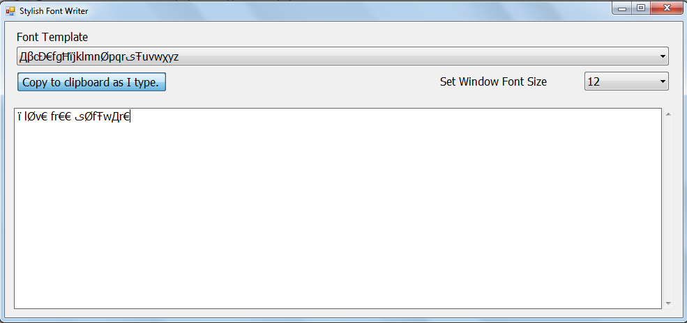 When you launch the application file you would see a simple window appear on your screen. It comes with a plain and simple interface where every option is easily accessible. By looking at the window itself you would know which option or space is for which operation. The 1st section at the top has a drop down menu which comes with the list of different styles and fonts which can be used to type in your text. It has 18 text options to choose from where each shape comes with its unique design and styles. Below this you have the option to click on ‘’copy to clipboard as I type’’, clicking on this the text which you type at the blank space at the bottom would be copied instantly. You could move on to any text document or the place where you wish to have the text pasted.