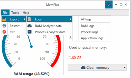 The File tab lets you export data from the RAM analyzer and process analyzer to other applications or users. You can also chose to export specifically RAM, Processes and Application log for more specific user end experience. Apart from this, users can exit the application or restart it from the File tab.