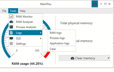 The basic interface of this application is really very simple. On the left hand side there is a meter which shows the RAM usage of your PC. The end of the meter is red in color, which indicates over utilization of RAM. You can view the total usage summary at the bottom in the form of percentage. The right hand side displays the amount of total physical memory and used physical memory, along with a Clear Memory option. In the Clear Memory tab, you can choose to clear the file cache or clear the working set as per your choice.