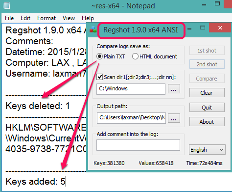 Regshot is one of the simple and best software in this list. It is very easy to configure and generates detailed log file to show comparison for registry changes. You can generate log file as HTML or text file. In results, it shows total number of deleted keys, keys added to registry, files added, attributes modified, values modified, values deleted, and total number of changes happened to registry. Apart from the count, it also shows which value, keys, and files are changed. So, it generates effective results.
