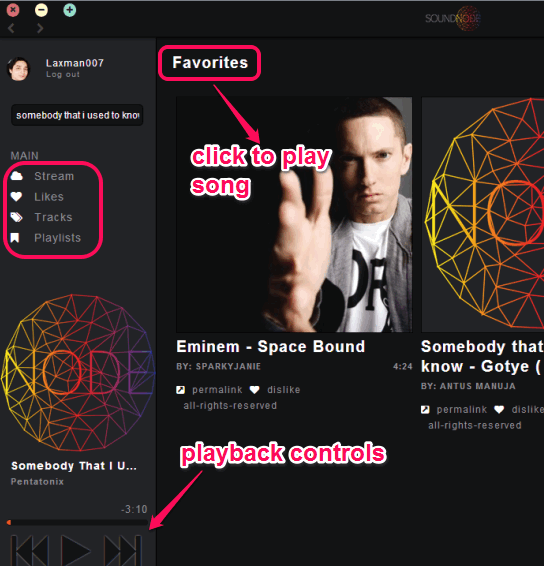 Soundnode App (beta) is a free SoundCloud desktop client. You can stream your SoundCloud playlists and favorite songs right from the desktop. Moreover, it also helps to search for new tracks, play those tracks, and mark them favorite for later use.