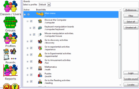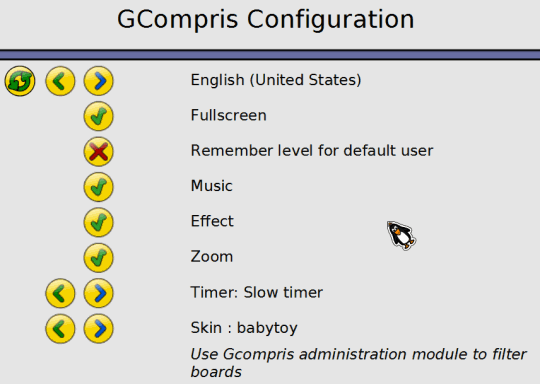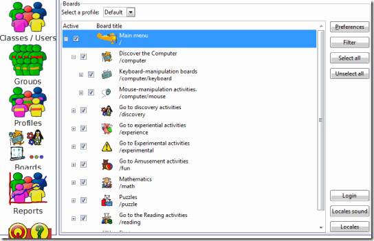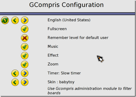 The software also provides an administrative control over the game. It can be accessed using the “GCompris Admin” icon on the desktop or in the start menu. The Admin screen looks like the one below. It allows you add users, groups and profiles. The boards allows you to select which board games will be available to the players. The Reports gives you which player has played which game and whether he/she has lost or won.
