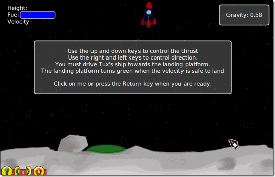 The ones with the cross beside them are not available in the free version for Windows. The ones without the cross can be played and clicking on one of them will start the game. As of now I am going to play Land Safe, a game which helps in understanding acceleration due to gravity. It is the one with the Rocket Symbol.