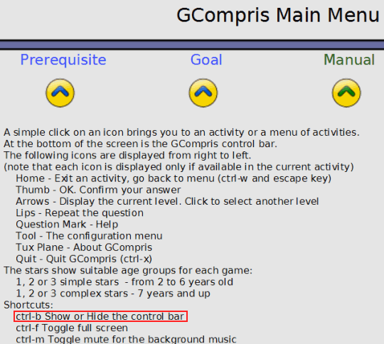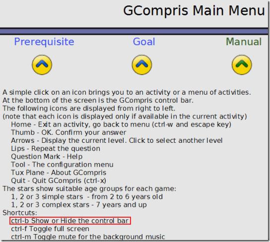 You can change the settings according to your wish. The Help button (one with Question Mark) opens a screen like the one below. Few things mentioned in the help manual are quite good. If you are giving the computer/ laptop to kids for playing the game and you do not want them to exit the game. It has options to hide the Control Bar.