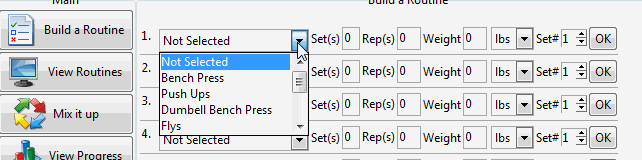 Here you can select any exercise from the given list: Bench Press, Push Ups, Dum bell Bench Press, Flys, sit-ups, crunches, flitter kicks, butt kicks, etc. Specify the sets, Rep, and your weight.