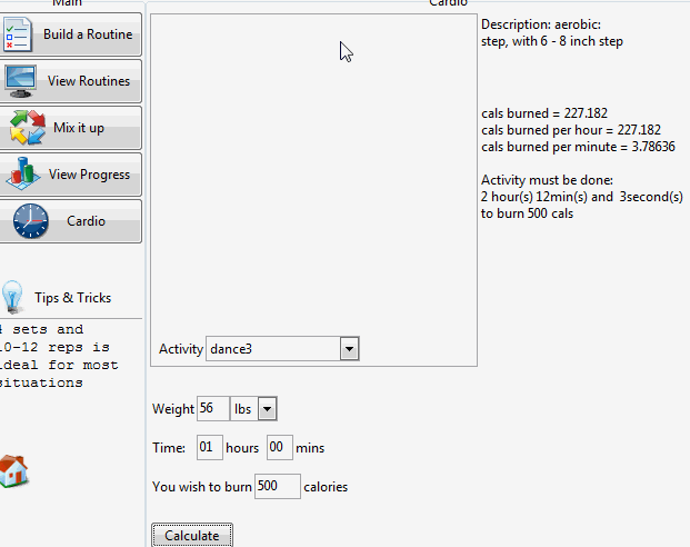 Using this option you can choose your activity like cycling, dancing, aerobics, etc. And just enter the calories you want to burn. Kamifit will give you the description of the exercise to be done and the number of times the exercise to be done and the total time for which to be done. It will also tell you how much calorie you can burn per hour and per minute.