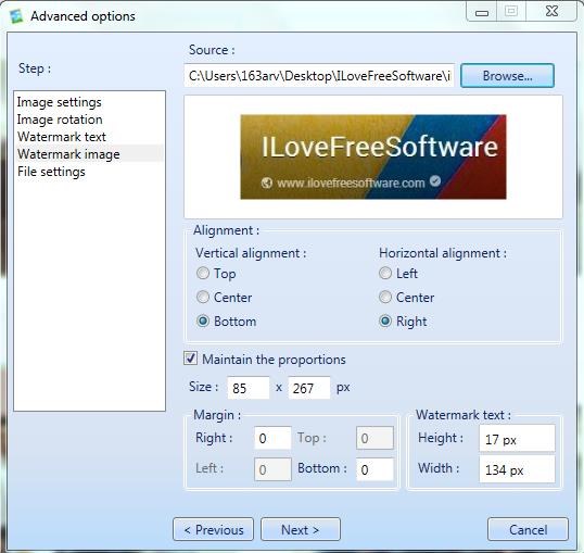 - Watermark Image: Here you can specify an image watermark (mostly a company’s logo ) to be applied to your image collection. Rest of the options are same as for Watermark Text.
