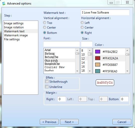 - Watermark Text: Here you can specify a text watermark to be applied to your image collection. Along with that, you can change its alignment with respect to the image, its font color and size, and margins.