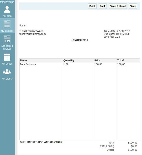 Created invoice can be seen on the image above. From here you can print it, save or send using buttons from the top right corner.