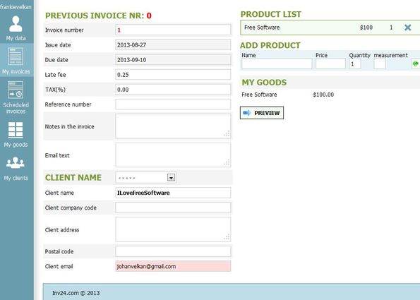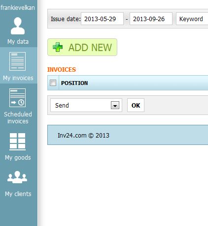 Inv24 is free online invoicing software which you can use to easily create and manage your invoices online. The only thing that you need in order to organize invoices with Inv24 is to register an account with the website. Once that you have an account, you can start adding clients and after that goods and services that you offer to your clients. Invoices can also be scheduled, next to being created and sent out right away.