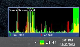 Also, this free bandwidth monitoring software has the ability to display all the details in a bigger window as shown in the screenshot above. This window can be hidden or brought to the front by simply clicking on the taskbar icon. In this larger window you will be able to see much more information about your current upload and download speeds. Also, you can customize the way things look, which include the ability to change the color, text color, transparency etc.. You can also make the task bar icon transparent.
