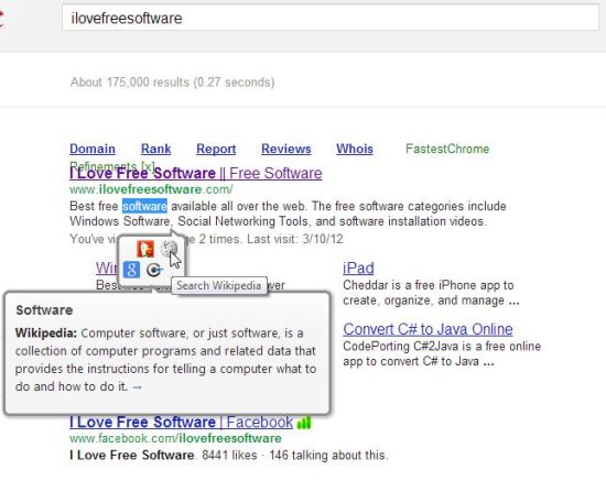 FastestChrome automatically loads consecutive search pages while you browse anything on the web, shows instant definitions when you highlight text, and pop up bubbles for more quick search options.