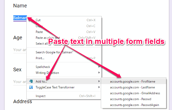 Here There is a free Chrome extension to paste text on multiple form fields. Using this extension, you can select multiple text inputs fields of online forms and then paste text from other tabs without manually copying and pasting the text. Actually, what happens is when you select multiple form fields in which you want to paste the text, the extension adds the fields to its watch list. After that, you can move to any tab from where you want to paste the text in the form fields. Now, all you got to do is select the text, right-click on the selection, hit the “Add to” option (added by this extension), and then choose among any of the form fields which you’ve selected in the form. As soon as you do that, the selected text will be pasted automatically into the chosen form field. In the same manner, you can just keep selecting text and pasting them to the form fields, without actually going to the form.