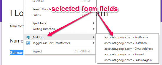 Step 3: When you’ve selected the input fields, you can go ahead and open up the tab from where you want to paste the text. Suppose, you have all your personal details stored in any of the online text editors, then simply open up any of them and then select the text which you would like to paste. After that, right-click on the text and hit the option “Add to”. Once you do that, you’ll be able to see the names of all the form fields which you’ve selected earlier, as shown below.
