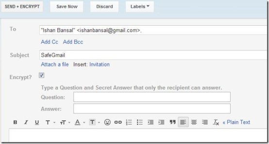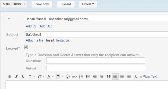 SafeGmail is a Chrome extension which let’s you send encrypted emails through Gmail. Install this SafeGmail extension to your Chrome and send secure emails.