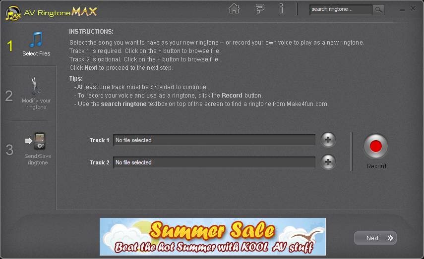To access the application window that you can see above, you first have to get an access code from the main website. Three steps are needed to create a ringtone with AV RingtoneMAX. First step would be selection of the audio tracks that you want use for the ringtone, or if you want to record, you can use the recorder and your microphone to record your own sound. At the bottom of the window you can see a small ad, and next to ads, additional software tries to be install itself during the installation.