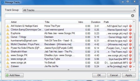 Once you adjust various settings in this free music player, you need to add music tracks to play. For this go to the “Manage” file menu and choose “Tracks” option. There you can add tracks either as individual files or directly from a folder. Once you finish creating playlist, you can open it to add songs on the built in players on PlayIt Live.