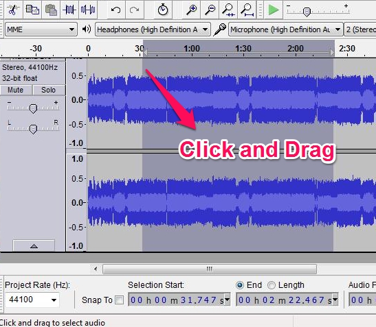 Step 2: Be sure to pause the song before starting the operation. Select the part of the song that you want to use from the wave (the part from which you want to remove the vocal). You can do this by dragging the mouse through the wave. If you want to select the complete song, just double click on the wave.
