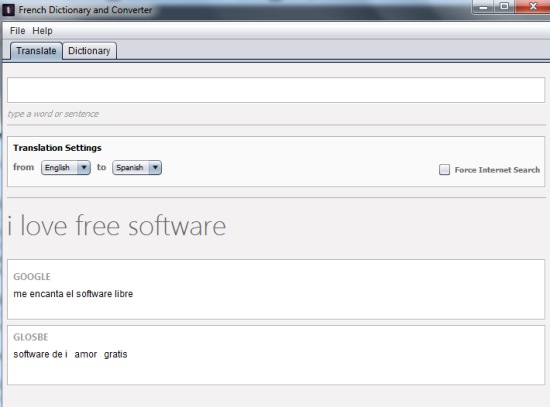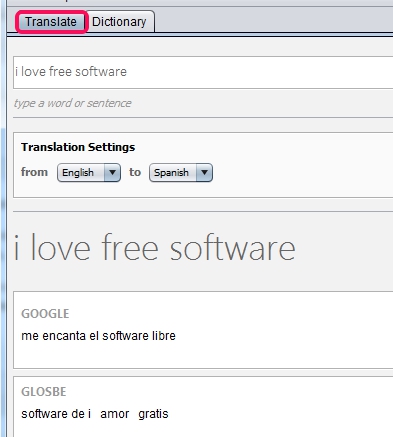 Translate tab allows to translate a whole sentence or word into any of the supported language. Just set the input and output language, enter the text at the required field, and press enter. You will find results at the bottom part using Google Translator and Glosbe.
