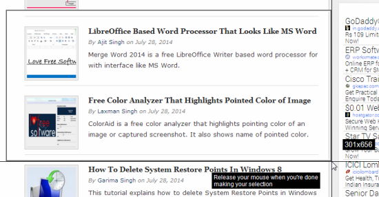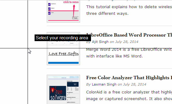 - Take the intersection of these lines to that point of screen from where you want to start the recording area. Now, drag your mouse and cover the area which you want to record. When you have covered the area, release the mouse.