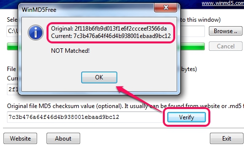 To verify generated checksum with another file, simply add second file, generate its MD5 hash, and paste first file’s value at available box. After this, just tap on the Verify button, and it will verify the hashes. If hash values are identical, then files are same, otherwise not.